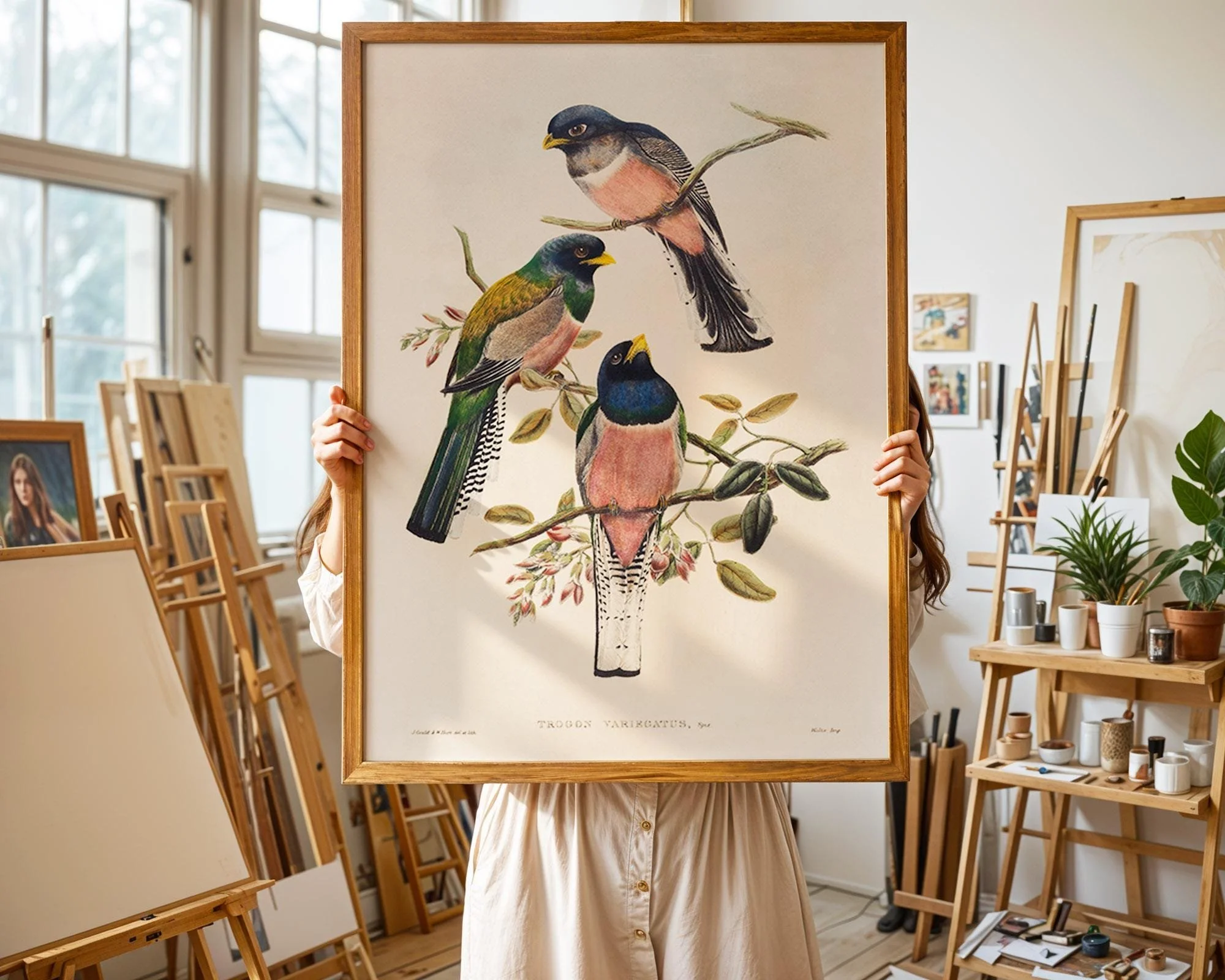 Bring timeless elegance and natural beauty into your home with this vintage bird illustration by John Gould (1804–1881) and William Matthew Hart (1830–1908). This high-resolution reproduction captures the stunning details of the Trogan Variegatus (Elegant Trogon), making it a perfect addition to any gallery wall, study, office, or living room.