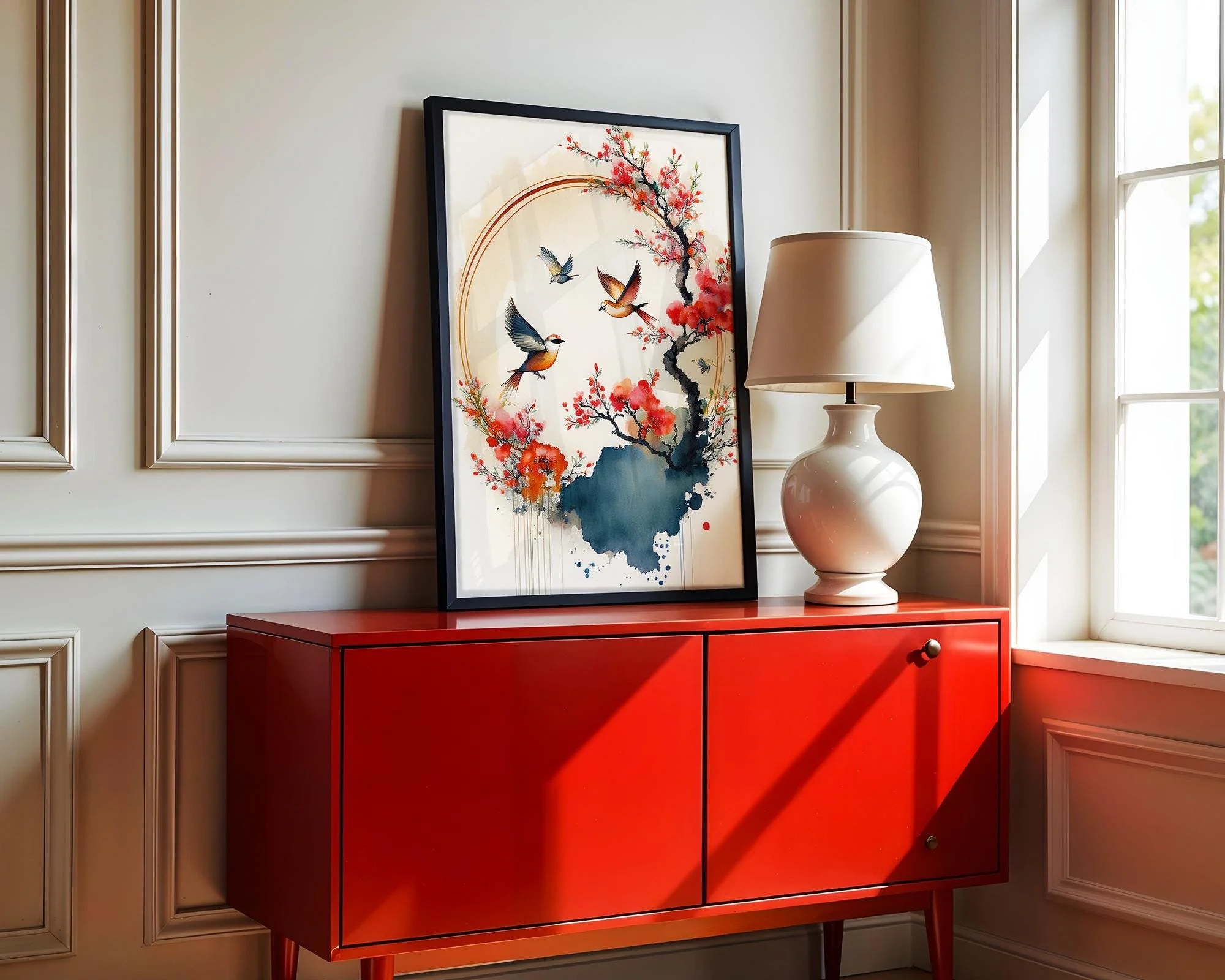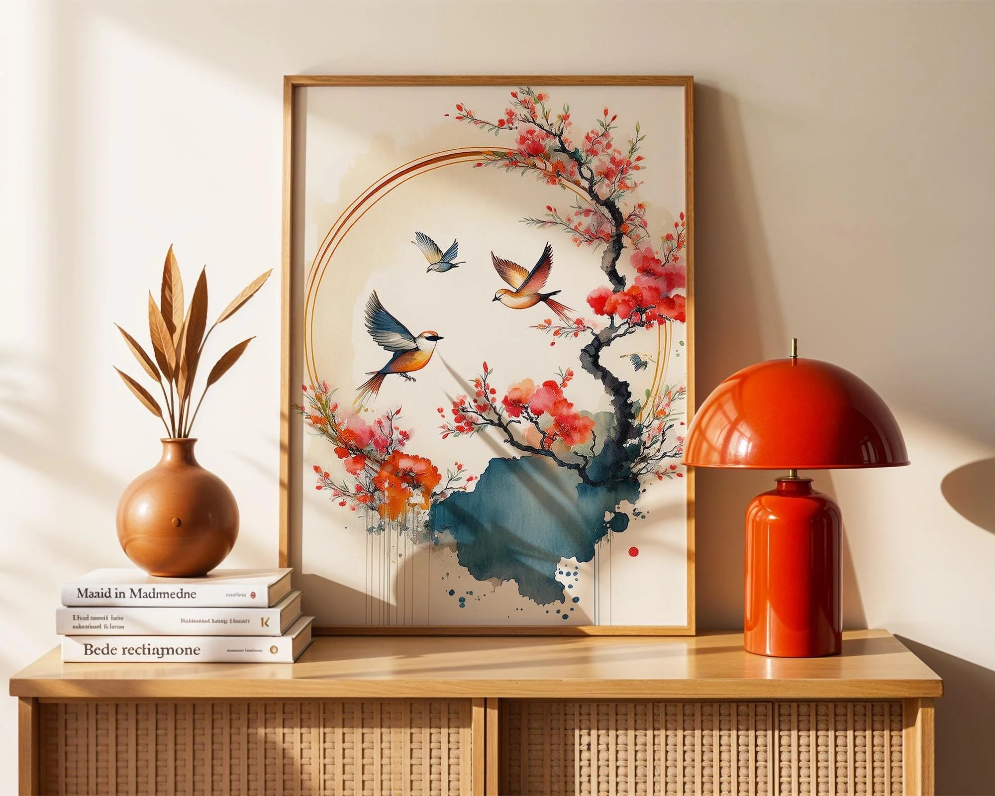 Immerse your space in serene elegance with this stunning Japanese-inspired watercolor print featuring delicate birds in flight, perched among blooming cherry blossoms. The soft yet vibrant hues of coral, indigo, and gold create a harmonious balance between nature and artistic expression.