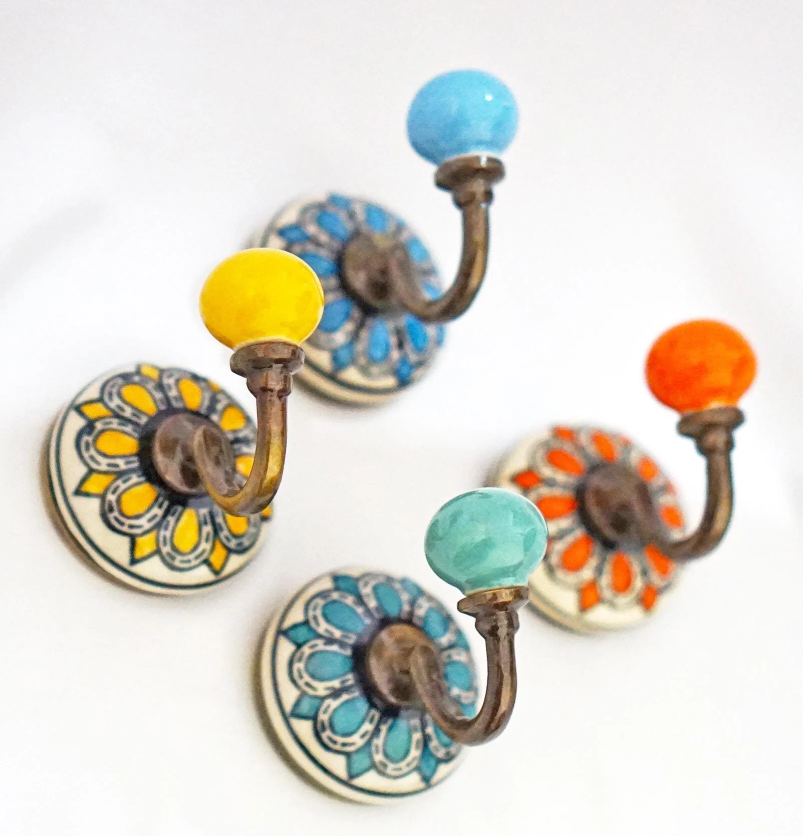 > Each hook features a unique, hand-painted ceramic tops in vibrant colors and floral patterns.